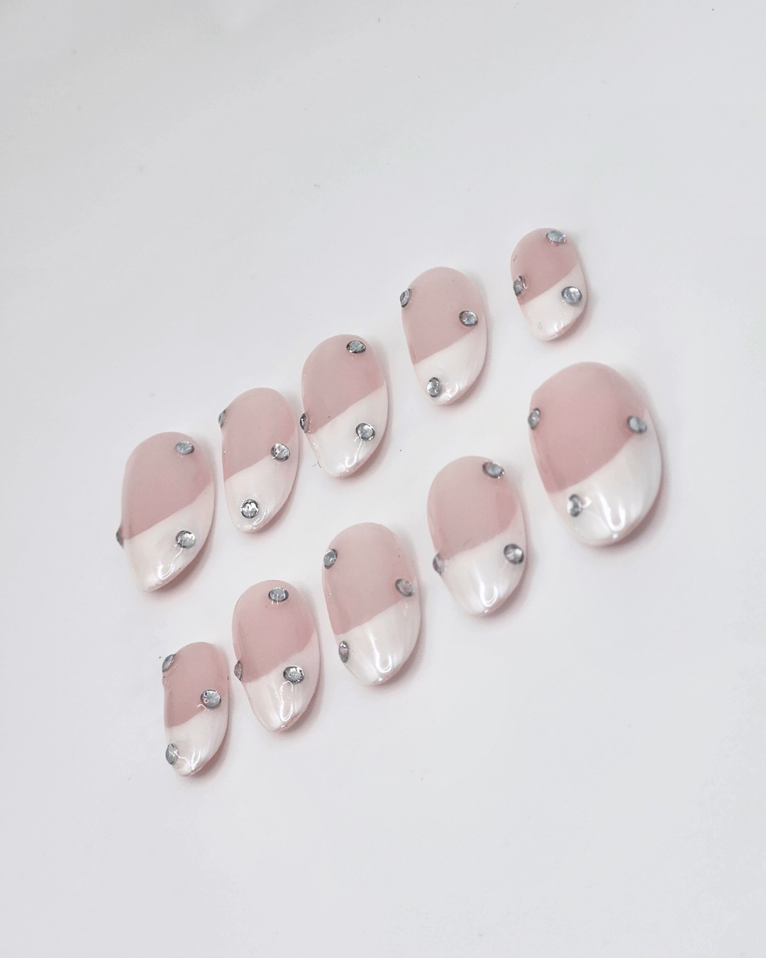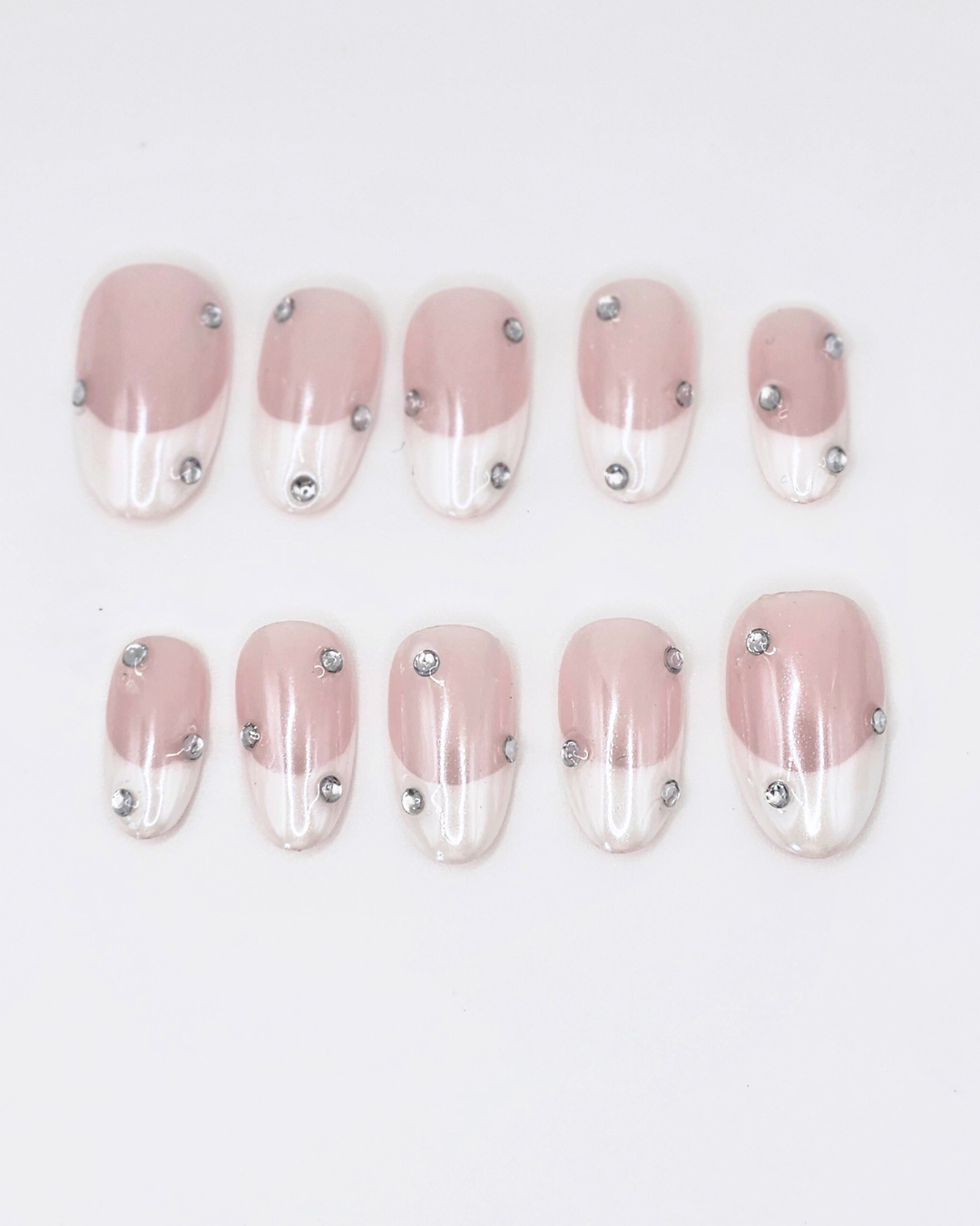 Features: White French Tips with rhinestones, topped with a pearl chrome