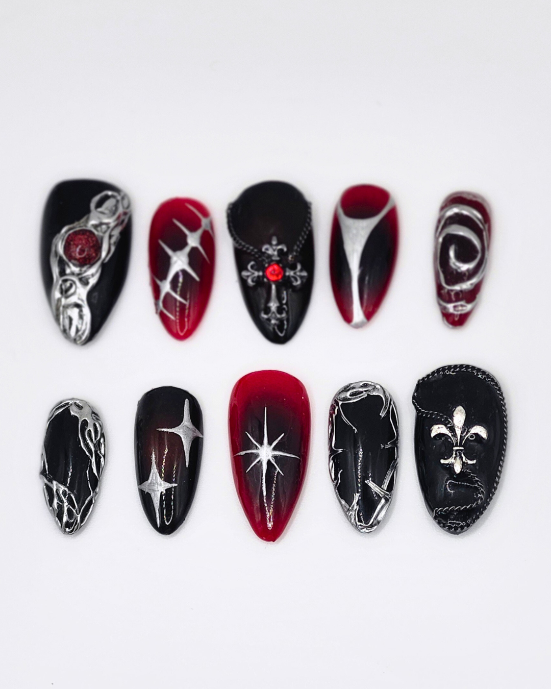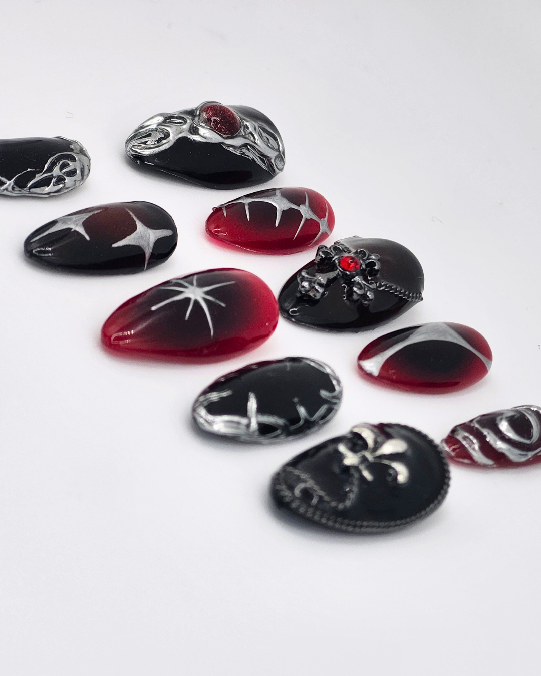 Features- Black and red base, black and red aura, silver accents, charms and 3d texture